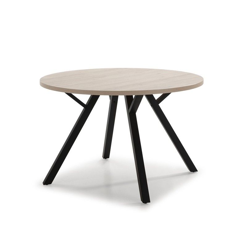 Table à manger ronde BENI en mélaminé et métal naturel et noir. Les dimensions du produit sont les suivantes : 120 x 120 x 77 cm.